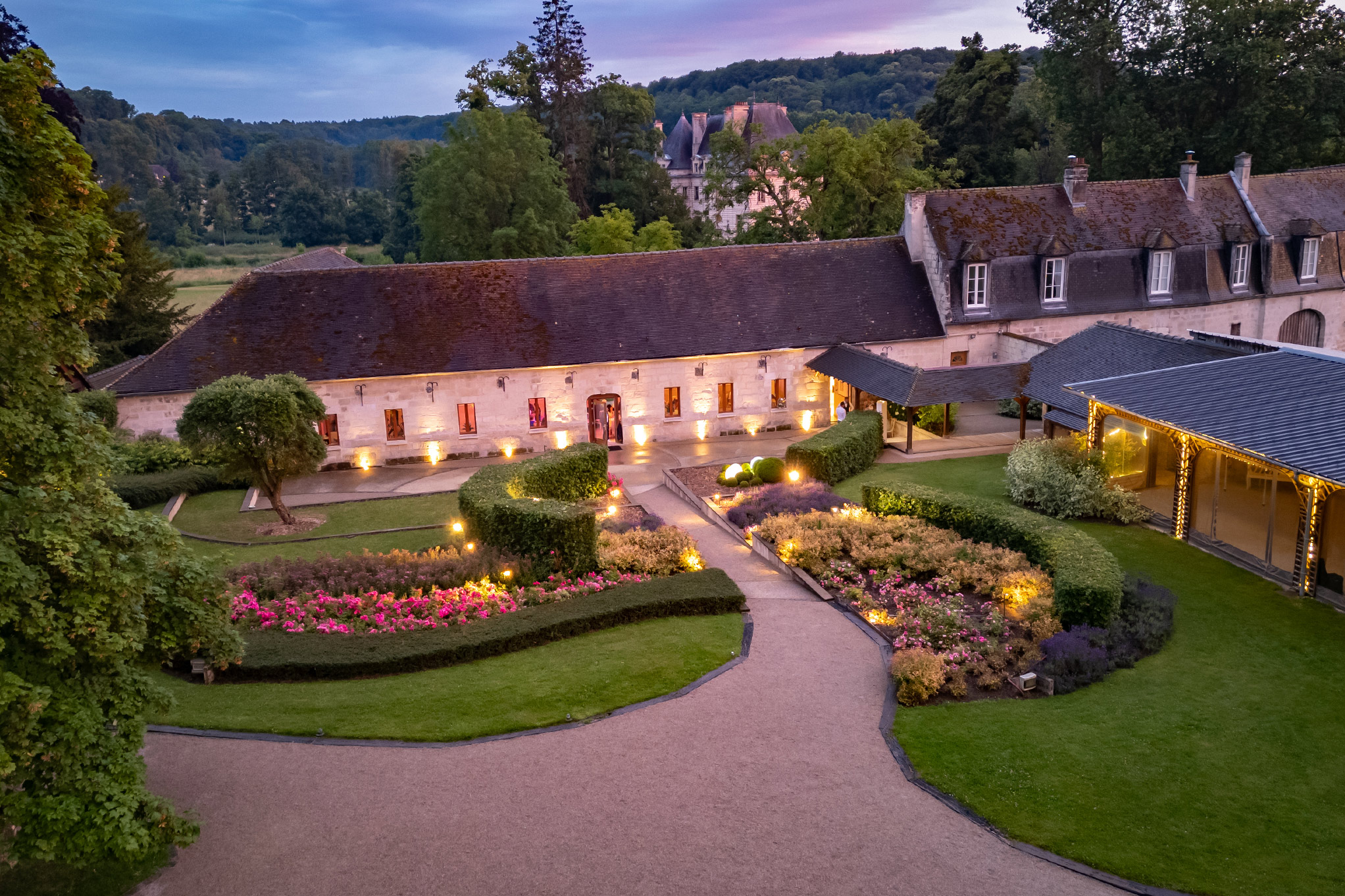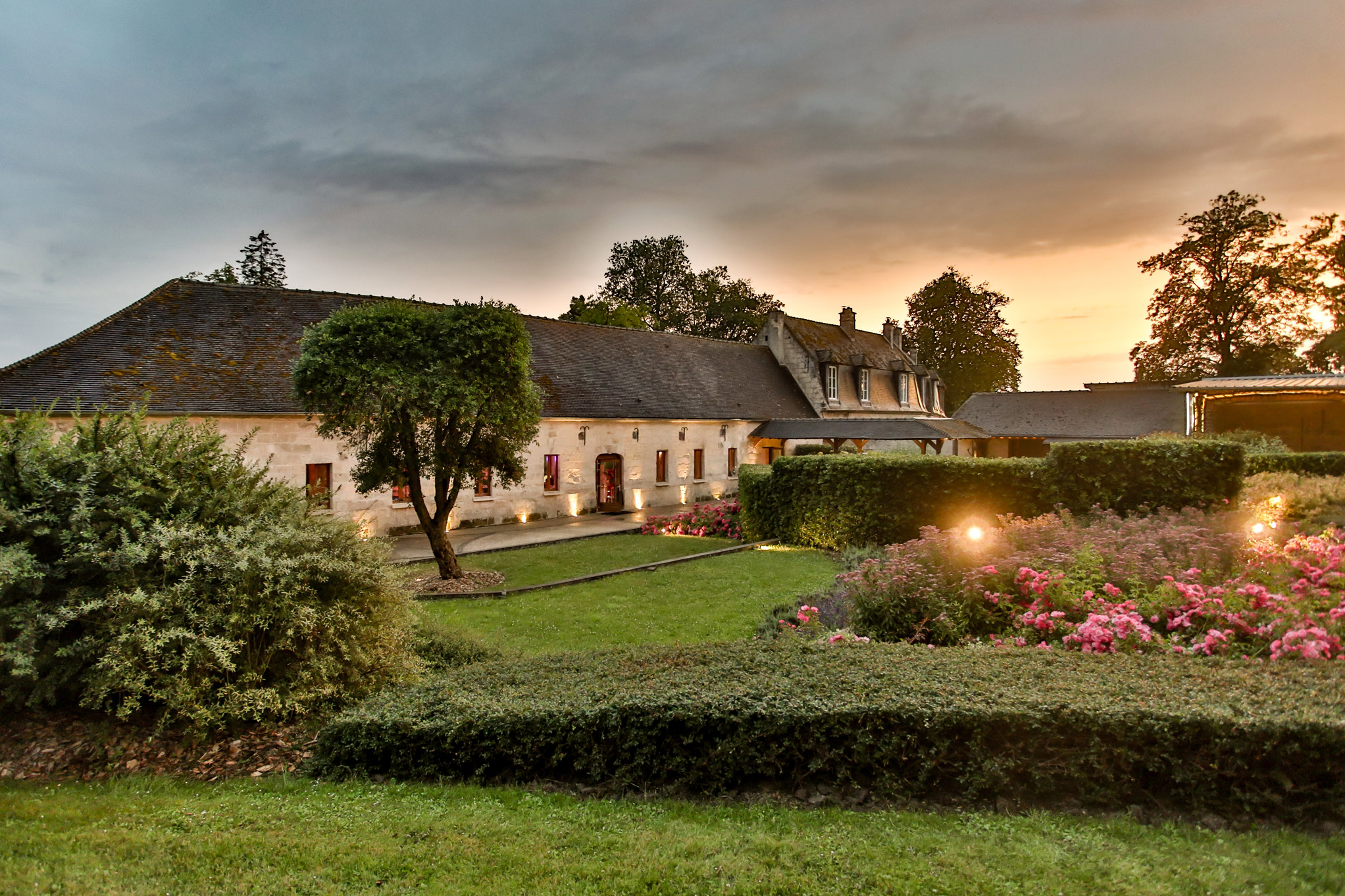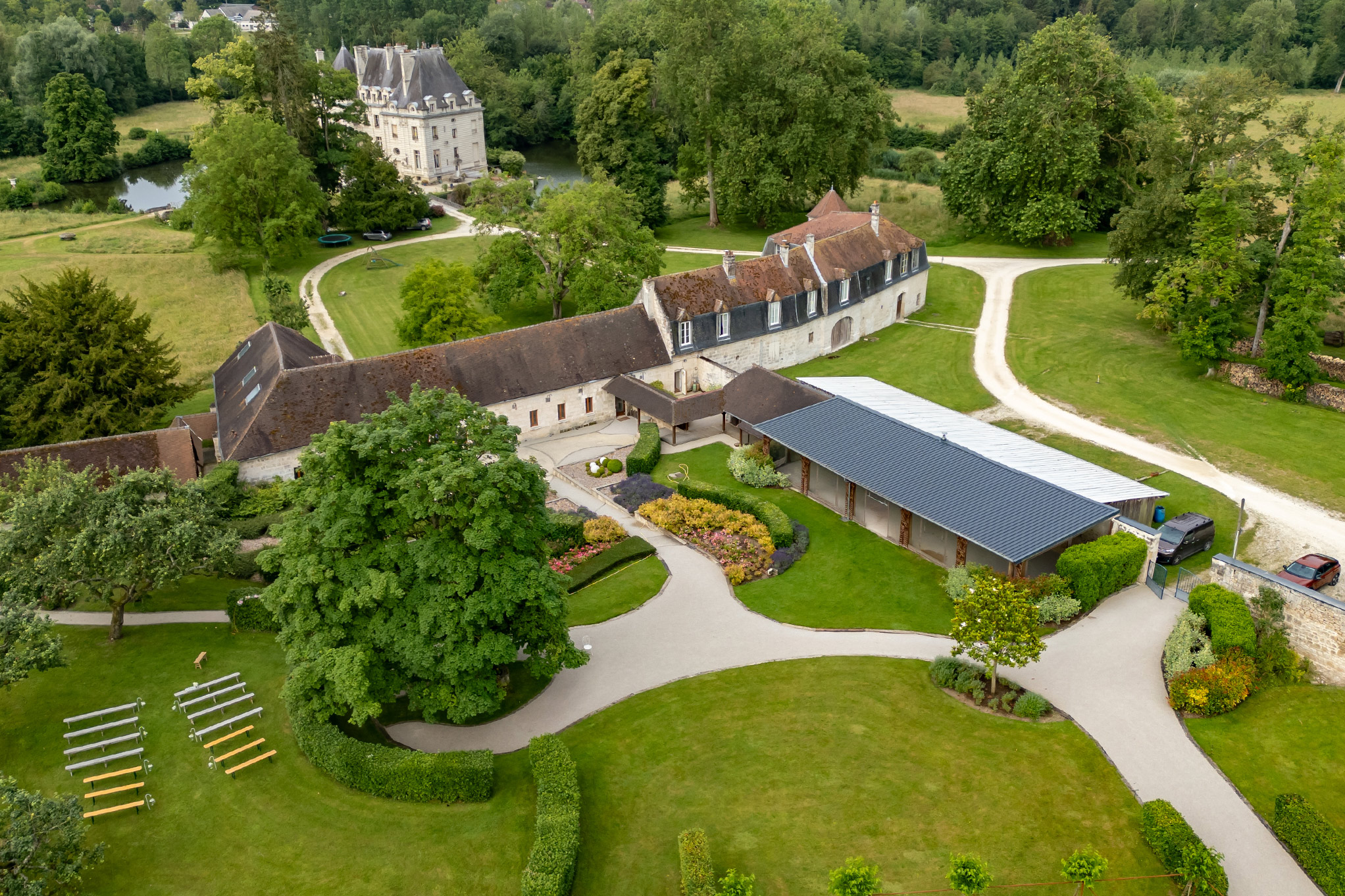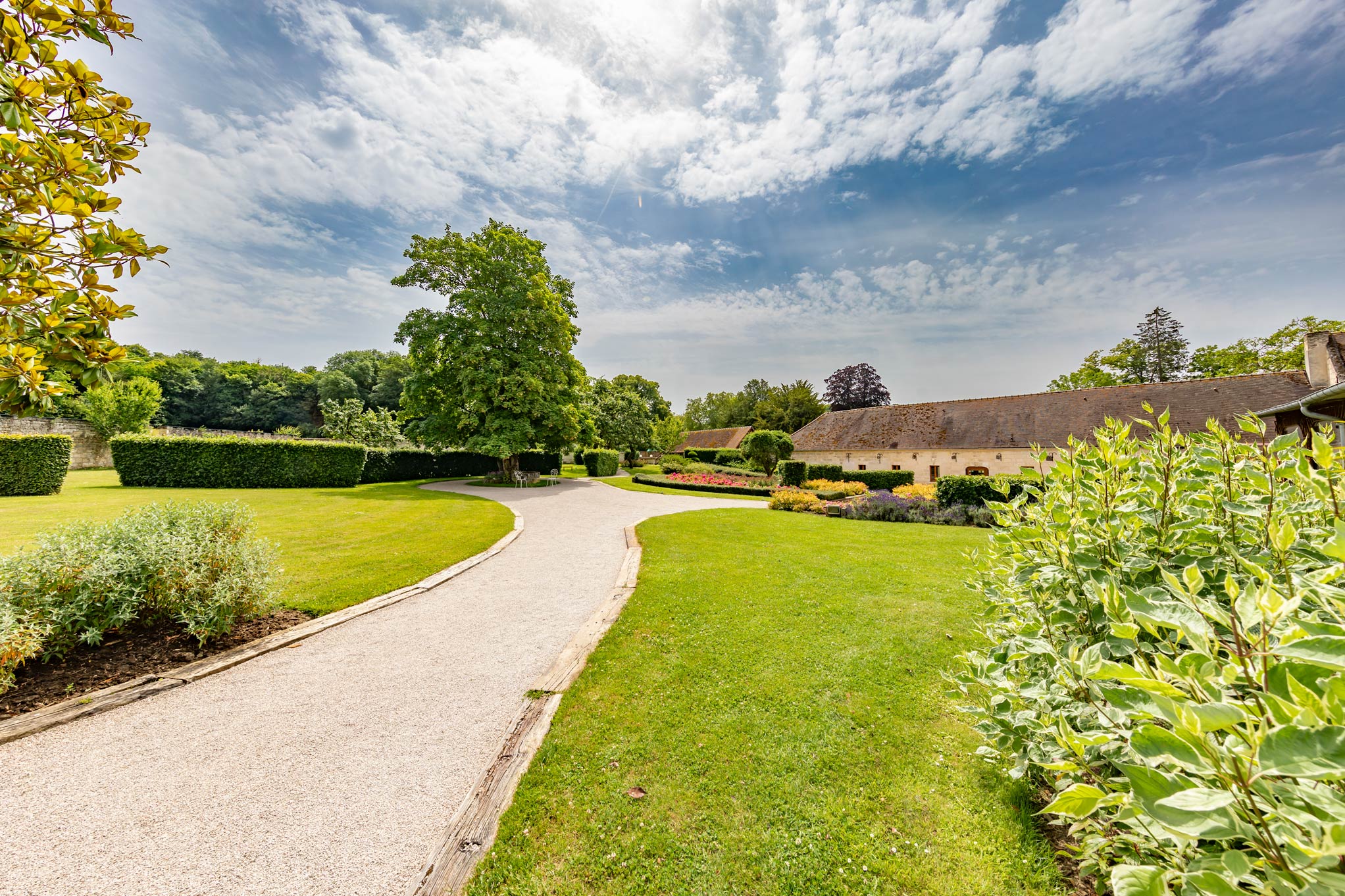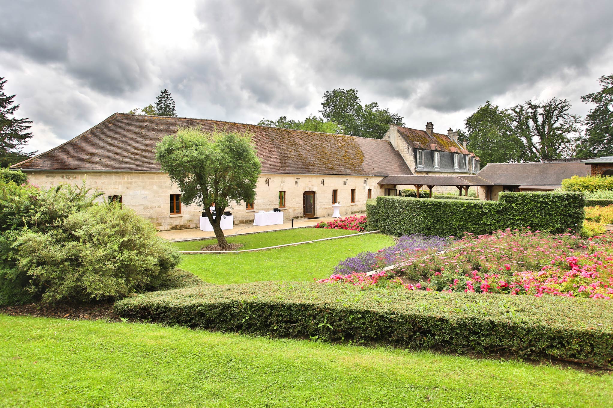 Un parc de plusieurs hectares offre une harmonieuse alternance de prairies et d’arbres centenaires. C’est dans les dépendances de l’ancien château que nous avons aménagé de vastes espaces de réception lumineux et spacieux, offrant un cadre idéal pour vos événements.
