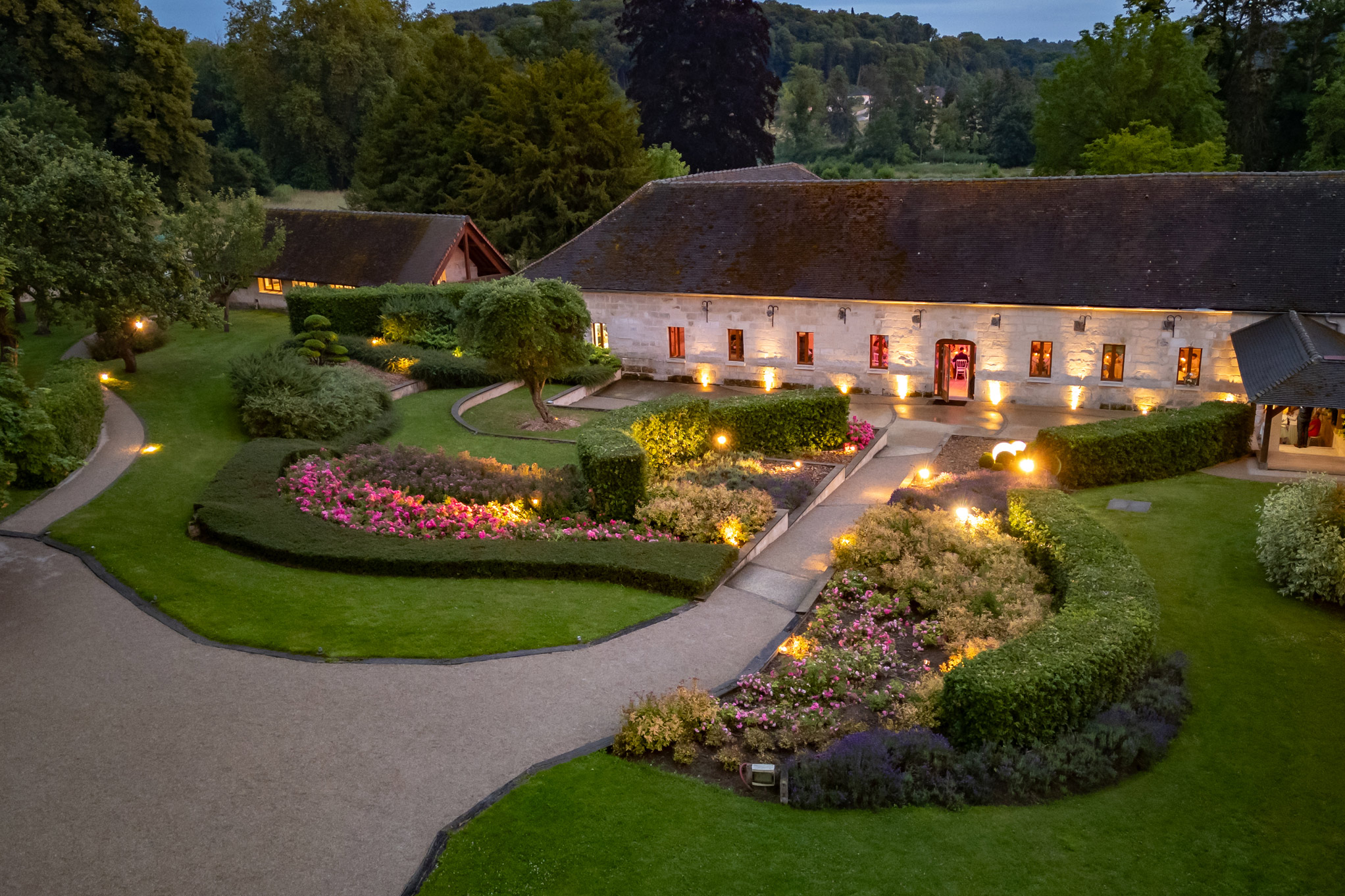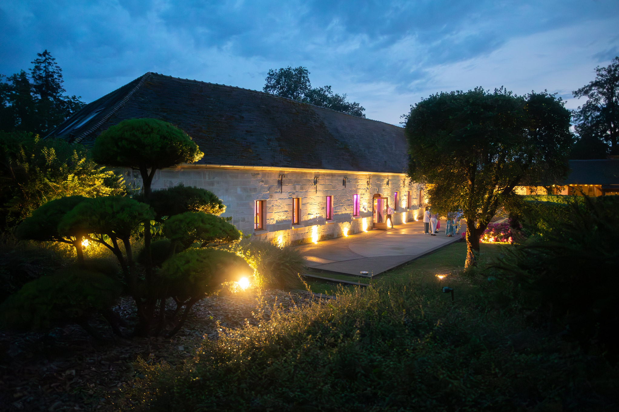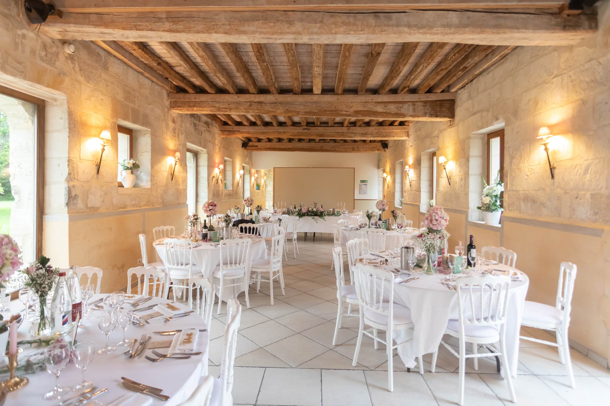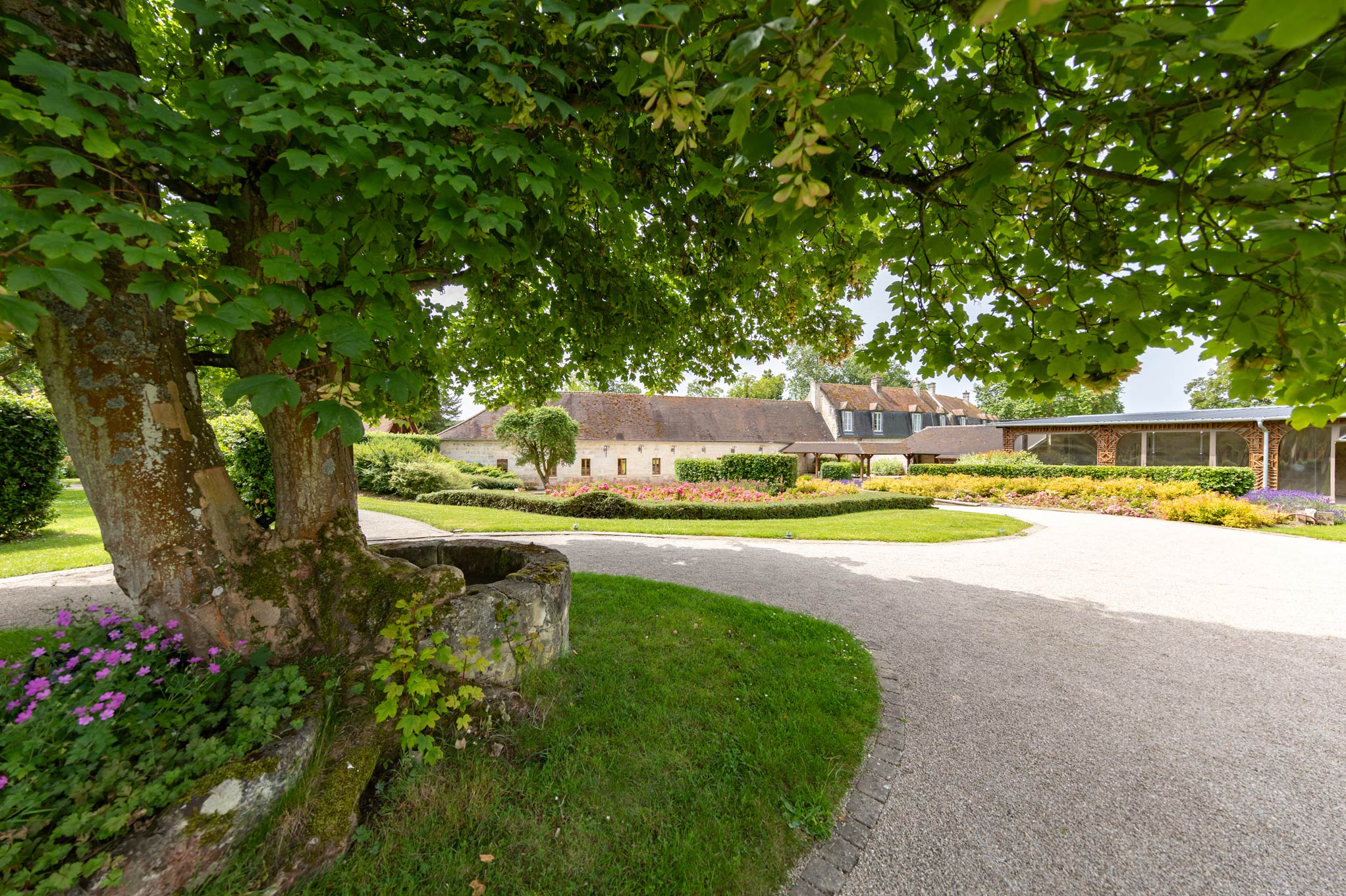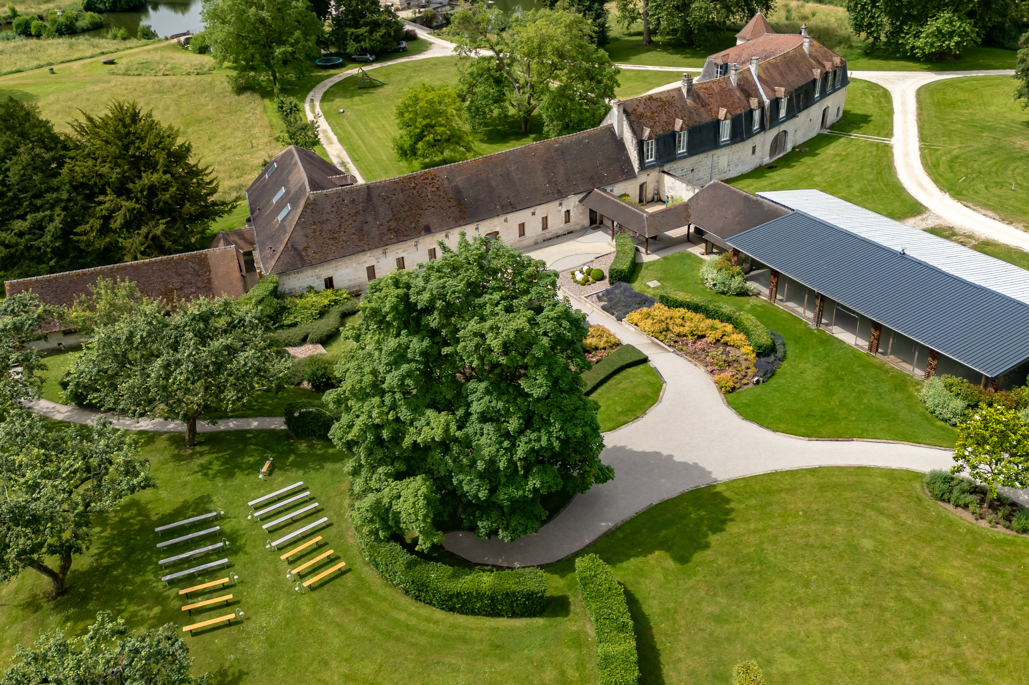 Un parc de plusieurs hectares offre une harmonieuse alternance de prairies et d’arbres centenaires. C’est dans les dépendances de l’ancien château que nous avons aménagé de vastes espaces de réception lumineux et spacieux, offrant un cadre idéal pour vos événements.