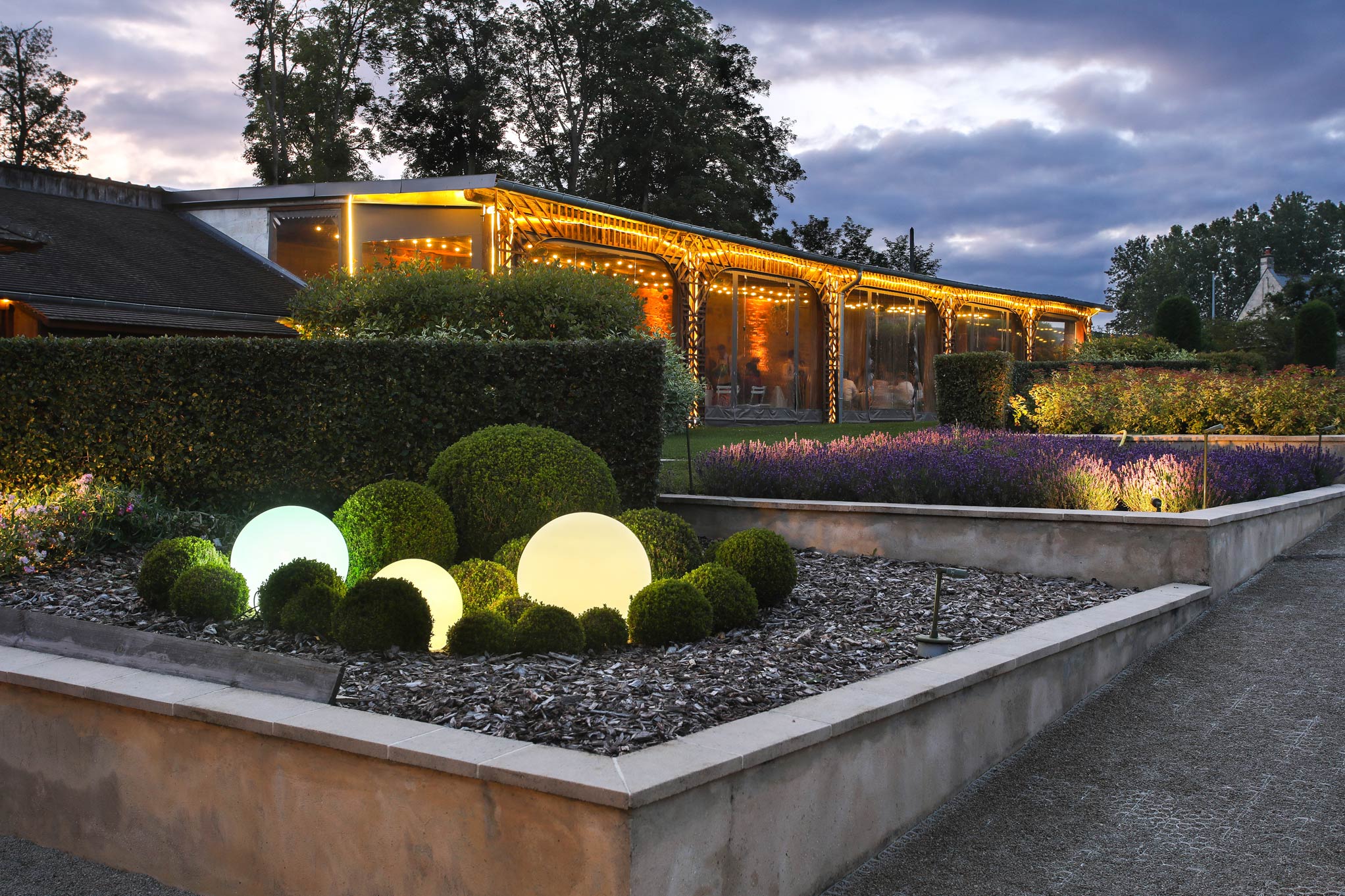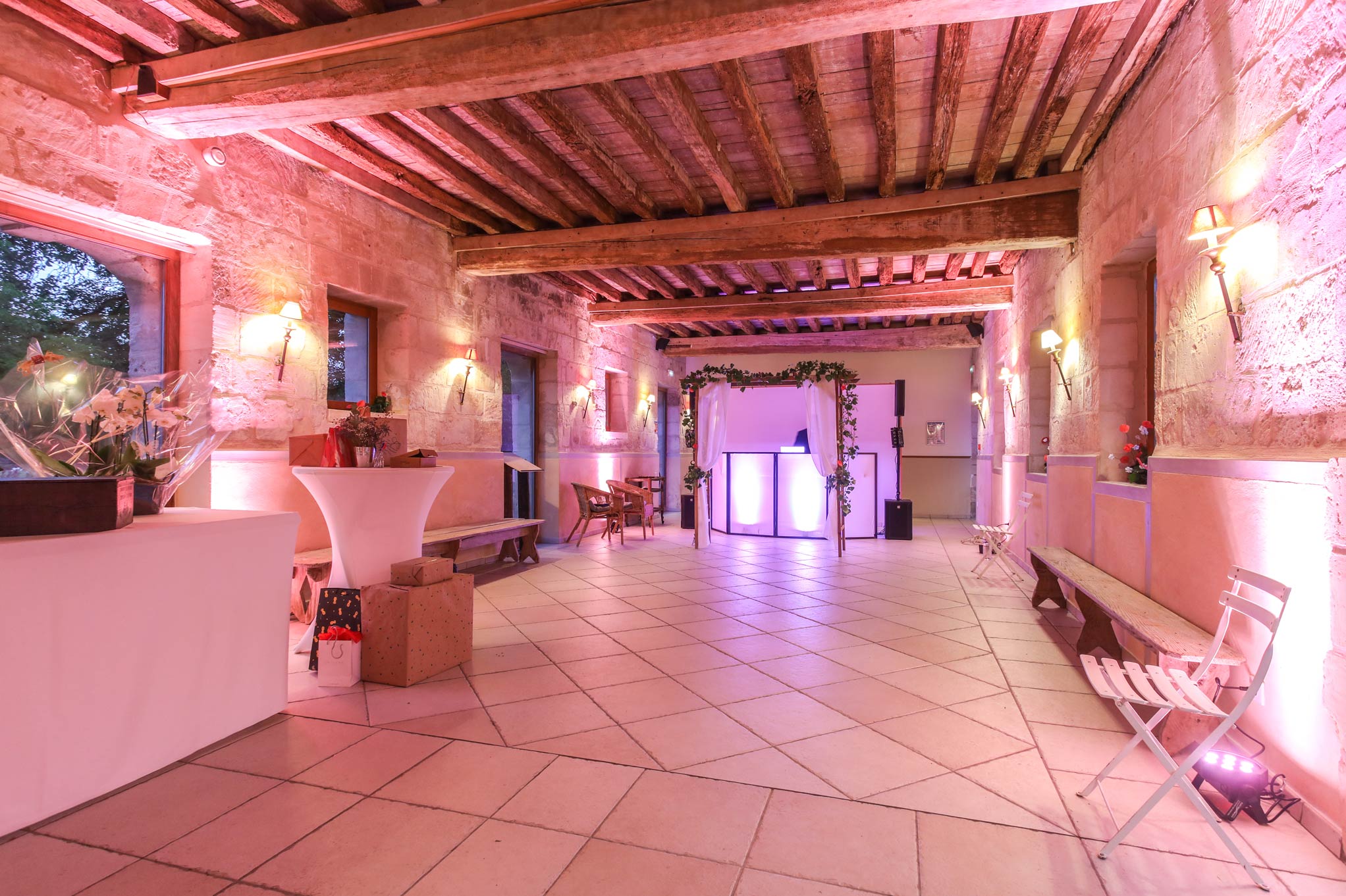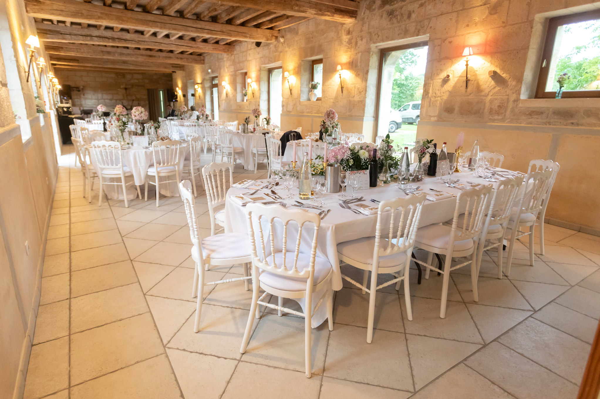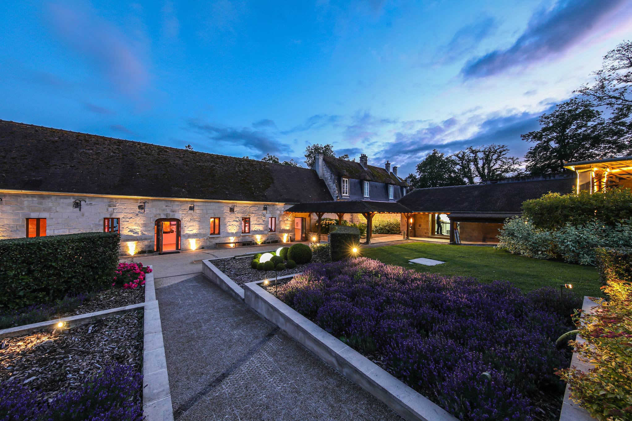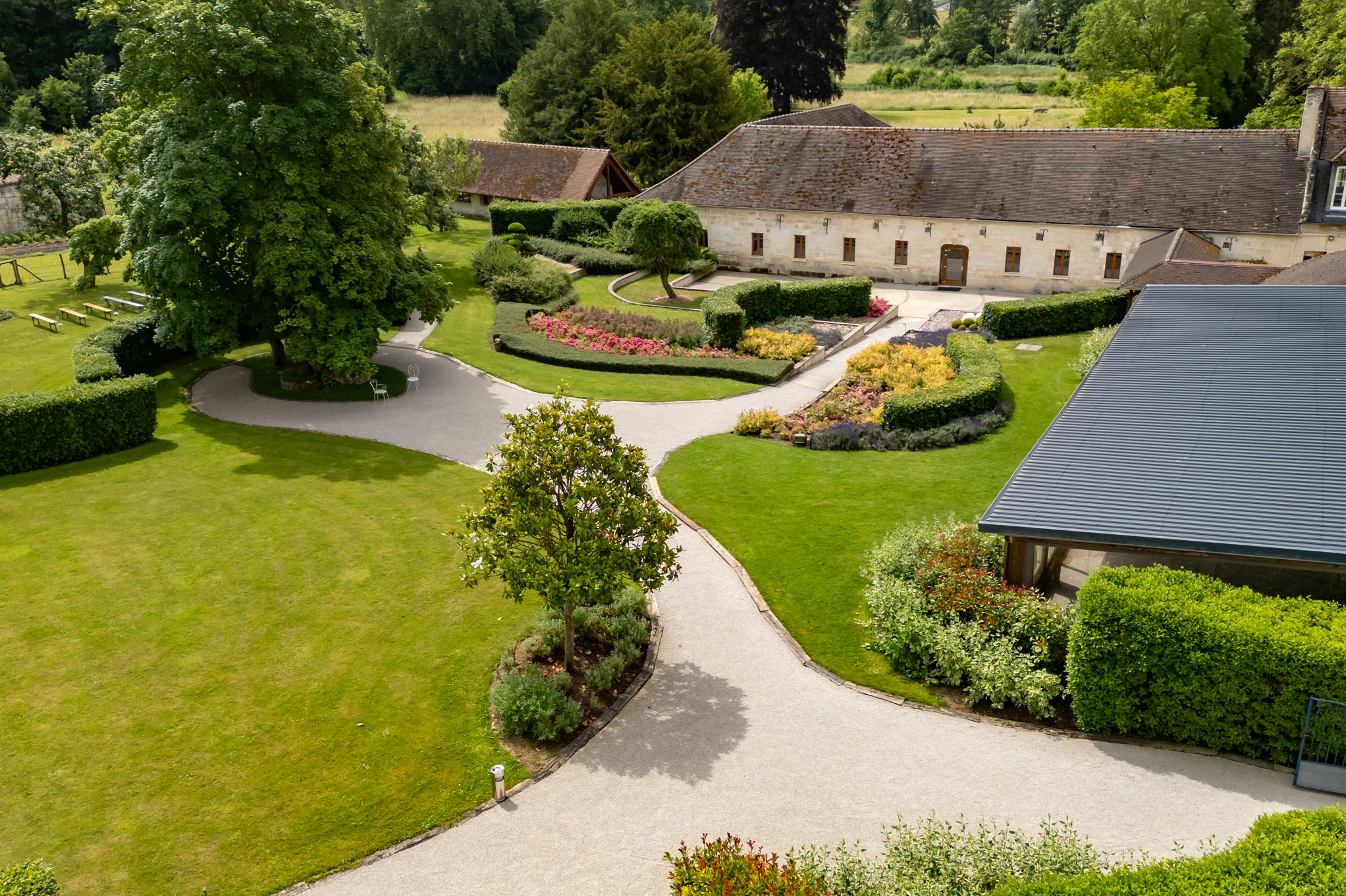 Un parc de plusieurs hectares offre une harmonieuse alternance de prairies et d’arbres centenaires. C’est dans les dépendances de l’ancien château que nous avons aménagé de vastes espaces de réception lumineux et spacieux, offrant un cadre idéal pour vos événements.