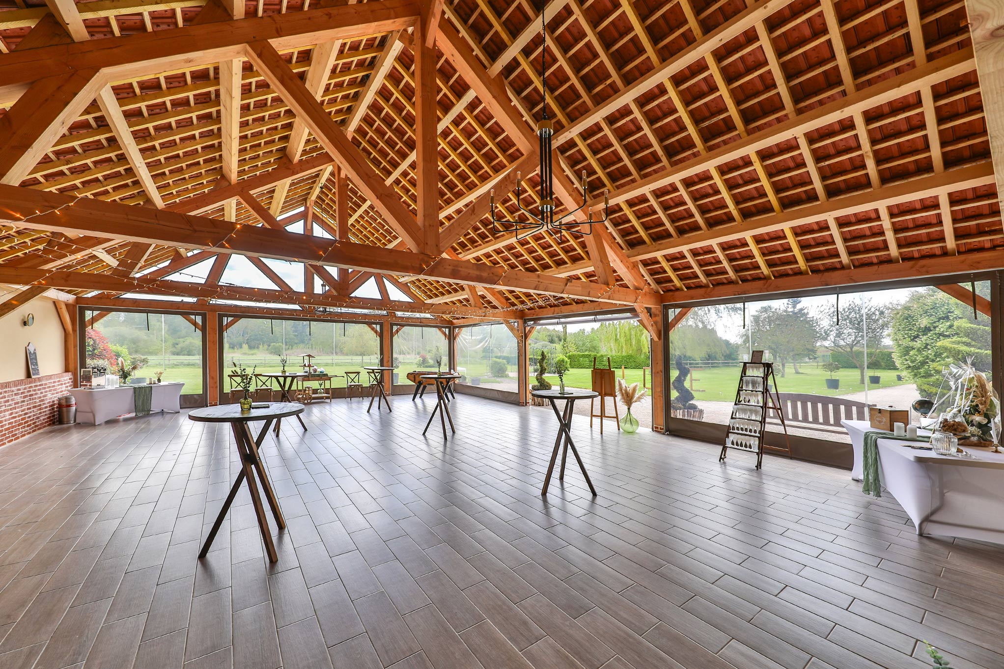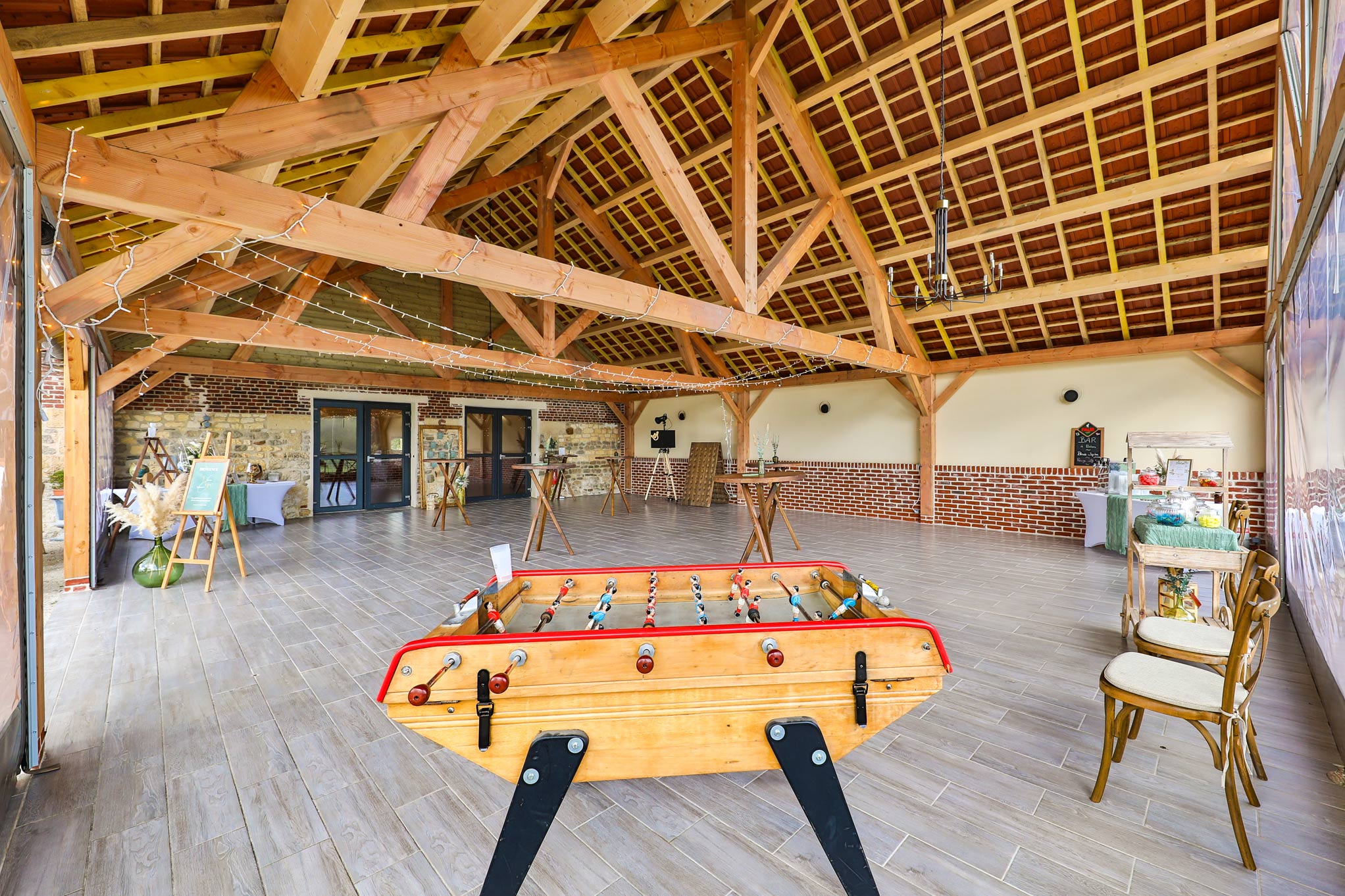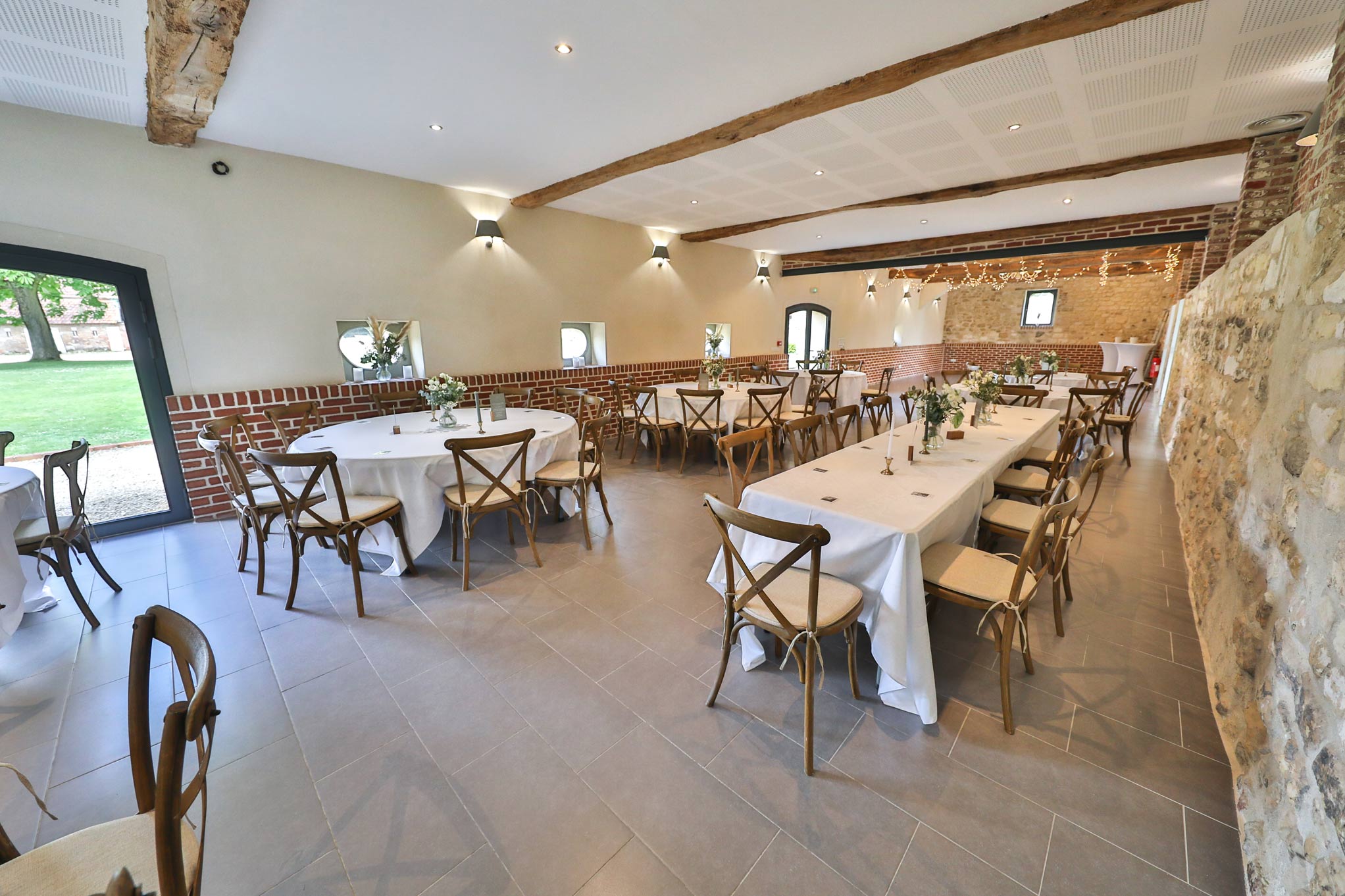 Les Écuries de Bayencourt met à votre disposition un domaine de plus de 2 hectares pour offrir un cadre idyllique et charmant à votre mariage. Une grande salle de 140m2 accueillera un maximum de 120 convives en places assises, qui célébreront l’événement dans un décor authentique, avec pierres et poutres apparentes, véritables ornements intérieurs. Le barnum disparait pour un espace coktail attenant à la salle couvert de 130m2 avec vue sur le parc immense et verdoyant, poutres et pierres apparentes ! Vous pourrez y accueillir jusqu’à 150 personnes.